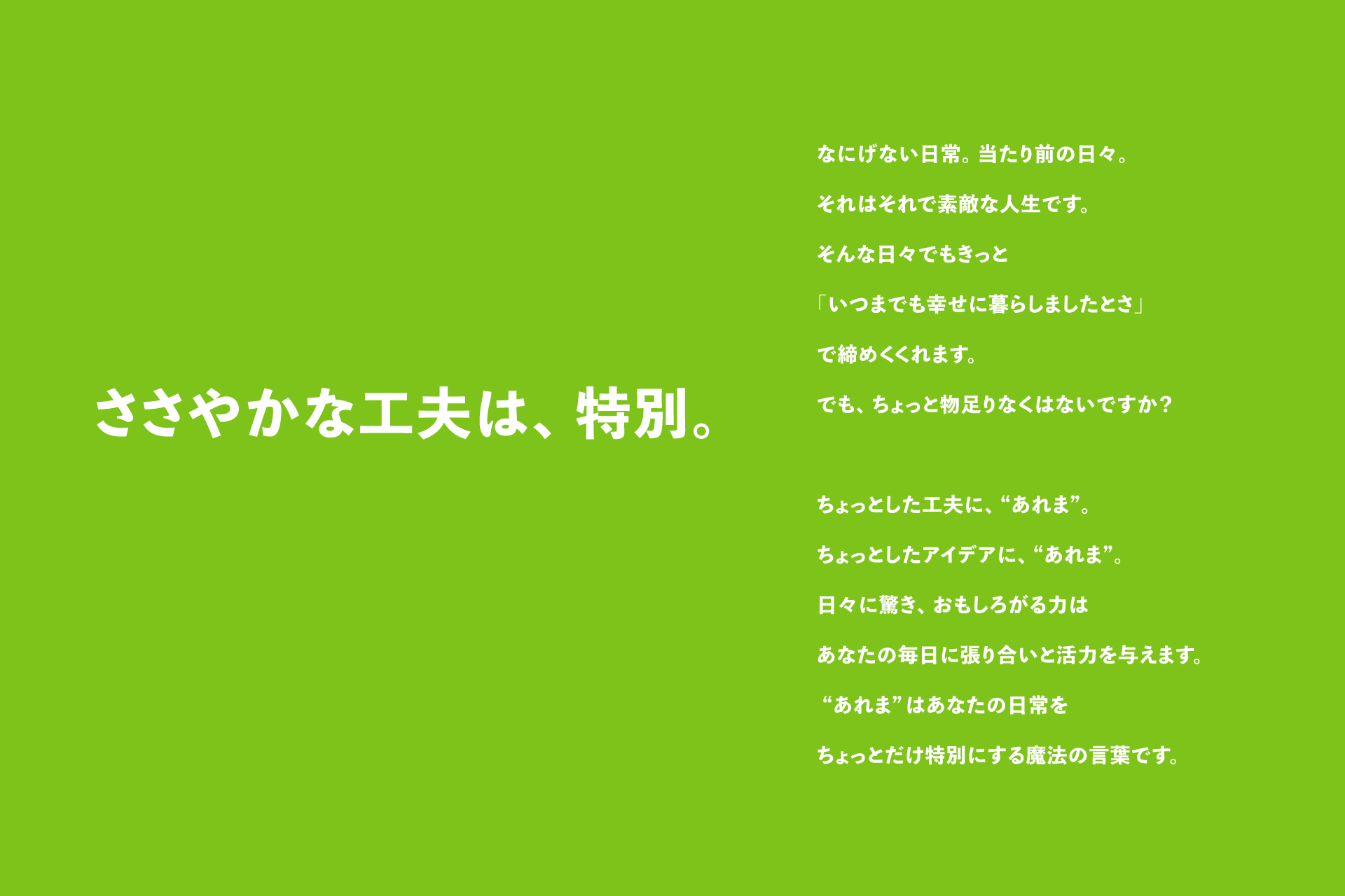 ブランドの提供価値「ブランドビジョン」を踏まえ、導き出した新ブランドのコンセプトは「ちょっとの工夫で毎日を変えよう」。ユニークなアイデア商品を取り入れるという「工夫」によって、日常生活や人生をより生き生きにしたものにしよう――そんな、日々の暮らしをちょっと特別なものにしたいと考えているターゲットに向けたメッセージになっています。そして、このコンセプトに基づいて生み出したブランド名が「arema(あれま)」です。